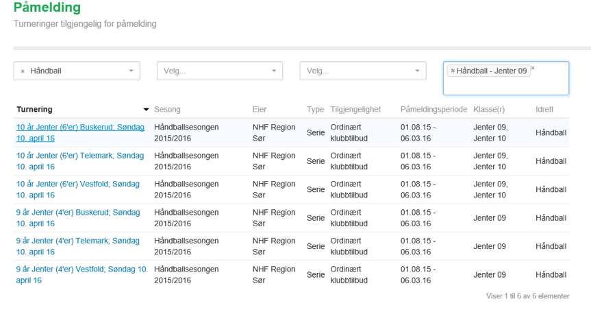 - Her vil alle turneringer du har tilgang til å melde på lag i komme opp. Kampansvarlig i klubb har tilgang til å melde på alle lag, og vil dermed få opp alle turneringer.