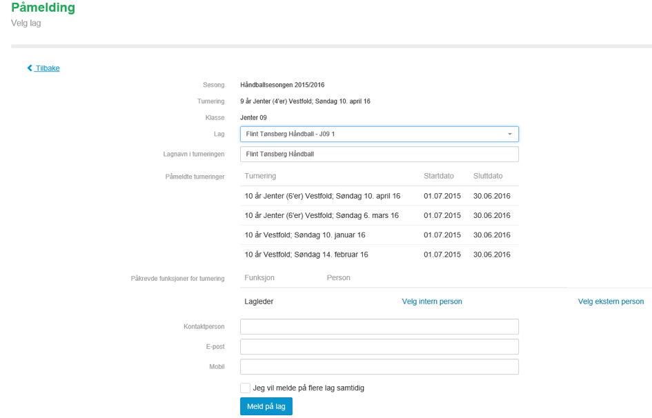 - Turneringen i eksempelet krever at det ligger inne en lagleder på laget for at påmeldingen skal bli godtatt. Klikk på intern person for å velge en person innad i klubben, eller ekstern person for å velge en person fra idrettens databaser, dersom det ikke allerede er lagt til en person som lagleder via SportsAdmin. (SA)