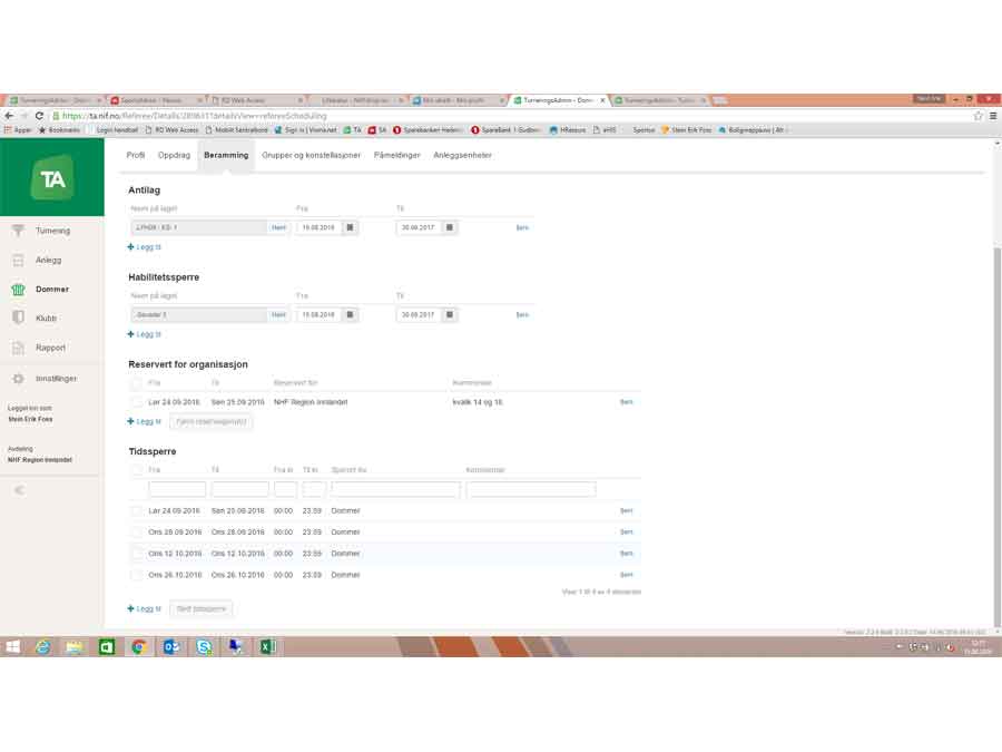 Alle dommere som har godkjent påmeldingen sin kan legge inn sperrer, dette gjør du i TA under Dommerprofil og Beramming; (se eksempelet under)